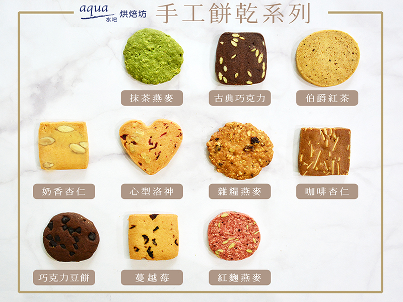 從飯店出身的aqua水吧烘焙坊店主人,運用在烘焙業20多年的經歷,追求蛋糕的美味外,並發展出許多具特色的商品。堅持用食品的天然原味,沒有太多複雜的裝飾,給消費者安心的商品選擇,以供應五星級飯店的用心,來挑逗您的味蕾~